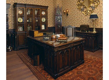 Перед нами - образец классического стиля, однако, американская мебель придает ему новое звучание и несколько упрощает его. В интерьере кабинета строгость и изысканность образуют гармоничное единство. Здесь реализован истинно американский подход к родовому поместью. В интерьере чувствуется благородство и глубина. Здесь все говорит нам о респектабельности хозяина. Деревянные панели на стенах, внушительные молдинги, массивные дверные порталы и мебель темного дерева, тяжелая фурнитура придают интерьеру основательность. Четкие прямые линии дивана и традиционно полосатая обивка в сочетании с кожей поддерживают аристократическую ноту. Формы предметов интерьера навеяны готической архитектурой средневековых соборов. Комоды и книжный шкаф украшены пилястрами и карнизом, стрельчатыми и полукруглыми арками. Роскошь интерьера создается за счет использования мрамора, резьбы по дереву, отделки черным лаком, дорогих тканей, бронзовых настольных ламп и декоративных деталей (заклепок на мебели). Однако, кабинет лишен надменной чопорности. Напротив, он необыкновенно уютен за счет теплой охристо-бордовой цветовой гаммы мягкой мебели и обоев. Гостеприимная и доверительная атмосфера буквально обволакивает любого, кто входит в комнату. Настольные лампы и необычный торшер с тремя маленькими абажурами создают мягкое освещение. Массивное «ушастое» кресло в духе Королевы Виктории приглашает опуститься на его мягкое сиденье, погладить гладкие велюровые подлокотники… В нем приятно придаваться философским размышлениям или слушать рассказы хозяина кабинета о его путешествии по Европе на манер английских джентльменов XVIII века, совершавших свои «гранд – туры». Привезенные трофеи - сокровища прежних поколений - занимают почетные места на полках: среди них амфоры, кувшины, шкатулки, фигурки животных, гравюры и гобелены, картины и карты. В неспешной беседе за чашкой чая забываешь о времени… И лишь маятник старинных готических часов ритмично отсчитывает его ход.
