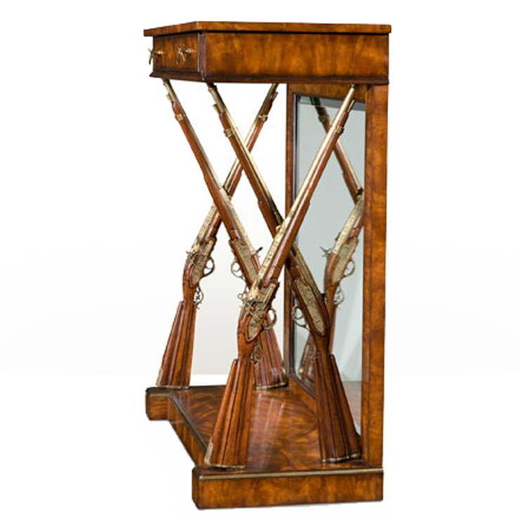 Консольный столик из красного дерева, выполненный по старинным образцам английской мебели. Прямоугольная столешница над длинным фризовым ящиком с изящными отлитыми из латуни ручками в форме скрещенных мушкетов и зеркальной задней стенкой. Торцевые опоры в форме резных, декорированных бронзой, скрещенных кремниевых ружей стоят на платформе с изогнутым вовнутрь фасадом.НА ЗАКАЗ