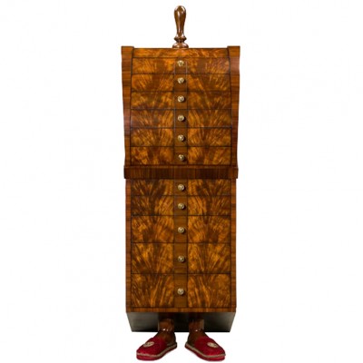 Комод из красного дерева в виде фигуры представительного джентльмена полной комплекции. Изогнутый фасад с 11 выдвижными ящиками, каждый украшен латунной ручкой с изображением львиной маски. Боковины обтянуты лиловым бархатом, на ногах надеты тапочки из красного бархата с вышитым на них фамильным гербом Спенсеров. Вешалка для шляпы съемная.НА ЗАКАЗ