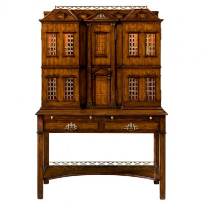 Бар для кабинета, выполненный по старинным образцам английской мебели, принадлежавшей историческому поместью Алторп. Каждая деталь английского бара — результат кропотливой ручной работы профессиональных мебельных мастеров. Нельзя не уделить внимание военной тематике, посвященной бывшему министру военно-морских сил Великобритании - 2-му Графу Спенсеру. Военная тематика использовалась американскими мастерами в отделке латунного навершия скатной крыши деревянного "домика" и нижней полки, соединяющей ножки. Верхняя часть в точности повторяет пропорции и классический декор настоящего английского дома. Экстерьер украшен латунными акцентами в виде герба семейства Спенсеров в центре фронтона, латунного ионического ордера пилястр и их оснований. Интерьер английского бара содержит несколько стеклянных полок, центральное запирающееся отделение, два выдвижных ящика и панели, отделанные тисненой кожей.НА ЗАКАЗ