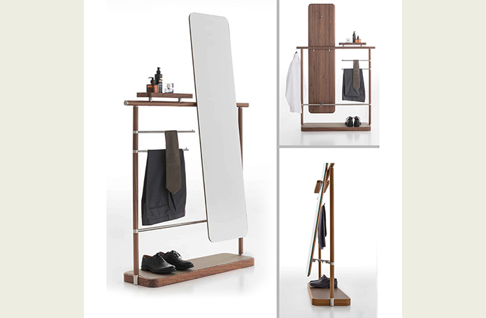 Стойка камердинера с антропоморфным названием Ben создана дизайнером Джузеппе Бавузо. Прочная конструкция сделана из трубчатого алюминия, штанги для одежды – из сатинированной стали. В отделке использован орех каналетто, кожа и мрамор. Стойка дополнена поворотным зеркалом с крючком и аккуратным ящичком для небольших предметов.
