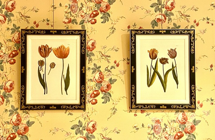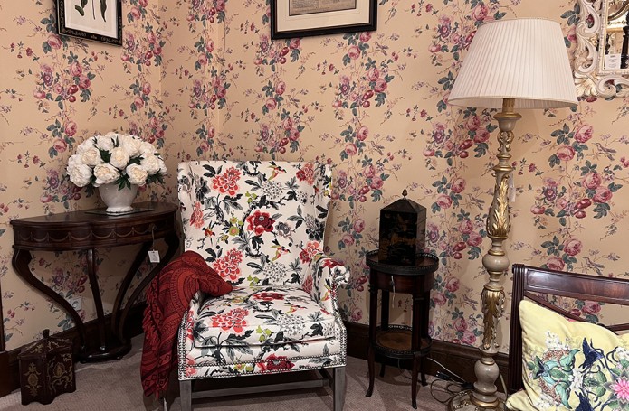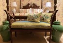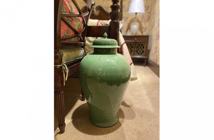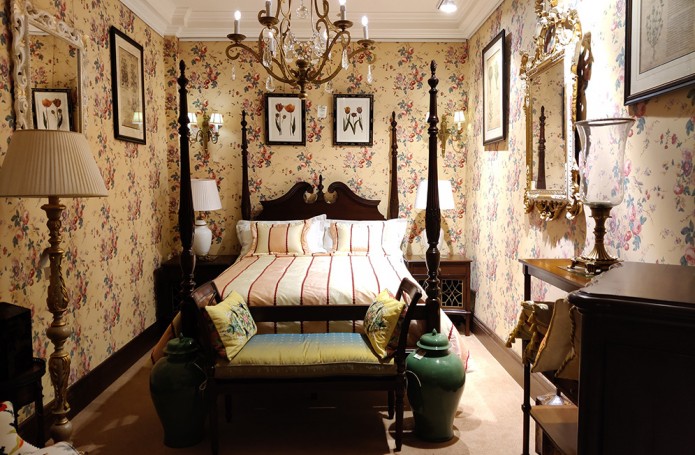 Представляем экпозицию спальня в классическом стиле, которая никогда не выйдет из моды. Кровать со столбами создаёт атмосферу уюта, как бы ограждая спящего от внешней суеты. Архитектурные элементы кровати отсылают нас к Георгианской эпохе, придают её облику великолепие. Обои «в викторианскую розочку» - один из популярнейших английских дизайнов. Пудрово-розовые и бордовые оттенки прекрасно сочетаются с зелёными керамическими вазами. Ушастое кресло за счет своей яркой обивки освежает интерьер, делает его артистичным.