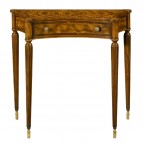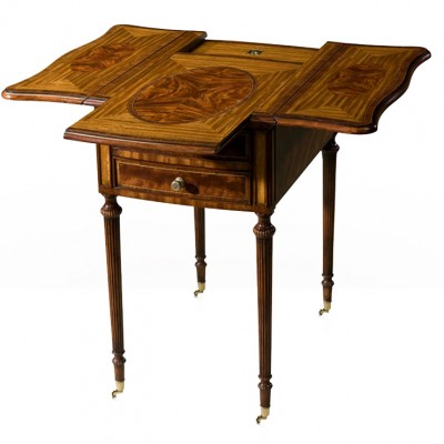 Трансформируемый письменный стол типа «арлекин» произведен американской фабрикой Theodore Alrexander. Столешница из атласного дерева декорирована овальной вставкой из "пламенного" красного дерева и фанерована поперечным палисандровым шпоном. Аналогичным образом декорированы откидные секции, имеющие волнообразные кромки. Подстолье с двумя выдвижными ящиками. Точеные рифленые ножки из красного дерева завершаются латунными роликами. Когда столешница отодвигается, вверх поднимается секция с двумя ящичками.НА ЗАКАЗ