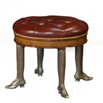 Оригинальный пуф с круглым сиденьем, обитым кожей и прошитым декоративными пуговицами. Ножки пуфа выполнены в виде латунных сапог с кожаными шнурками. Дополнительным украшением пуфа служат декоративные латунные гвоздики по окружности сиденья.НА ЗАКАЗ