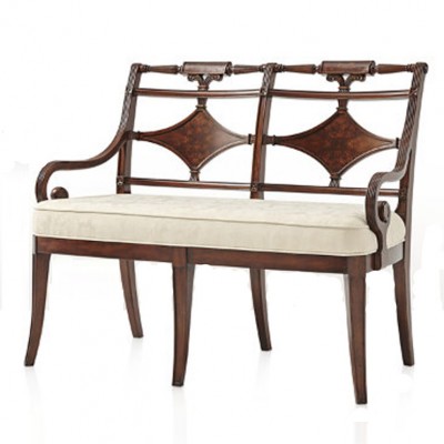 Скамейка из красного дерева с изящно изогнутыми подлокотниками и прямыми высокими ножками. Спинка скамейки вырезана из дерева в виде оригинальных узоров. Двухместная подушка сиденья обита тканью кремового цвета.НА ЗАКАЗ