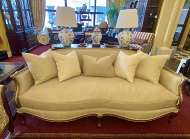 Большой диван от американского производителя с единой подушкой сиденья. Рама дивана отделана резьбой ручной работы. В комплект входят деокративные подушки.
