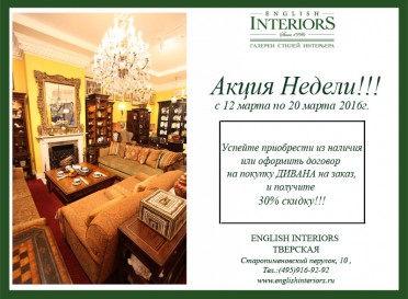 С 12 по 20 марта 2016 года салон "Английские Интерьеры" проводит акцию: при покупке из наличия или оформлении договора на покупку ДИВАНА на заказ Вы получаете скидку 30%!