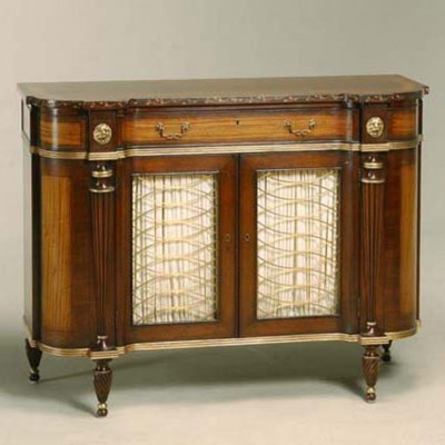 Небольшой изящный буфет на тонких фигурных ножках, которые дополнены акцентами из позолоты. Отделка буфета сочетает в себе шпон двух контрастных сортов древесины, что великолепно сочетается с изящной медной решеткой и муаровыми занавесками на дверцах. Буфет также оснащен вместительным выдвижным ящиком с фигурными ручками.НА ЗАКАЗ
