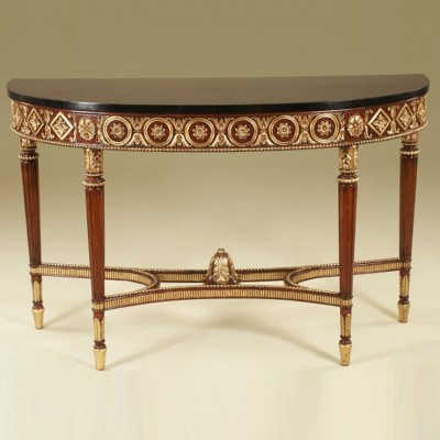 Элегантный консольный стол из красного дерева с закругленной черной мраморной столешницей. Четыре изящные канеллированные ножки украшены резьбой в виде листьев аканта и соединены между собой декоративным резным элементом. Подстолье в виде резного фриза с медальонами на центральной части и ромбами по бокам. Основной акцент на деталях сделан с помощью отделки активного золотого цвета, который подчеркивает цвет красного дерева и создает эффектный контраст с черной столешницей.НА ЗАКАЗ