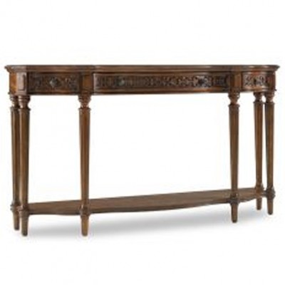 Элегантная американская консоль из твердых лиственных пород дерева имеет 2 маленьких выдвижных ящика по бокам и один большой посередине. Ящики украшены резьбой. 6 прямых ножек соединены полкой. Центральная часть американской консоли немного изогнута и выдвинута вперед.НА ЗАКАЗ
