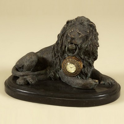 Настольные часы с мужским характером! Оригинальные часы выполнены из отлитой бронзы в виде лежащего льва, держащего в пасти кольцо с циферблатом. Циферблат оформлен пеншелом, уникальным природным материалом из раковин морских моллюсков. Основание выполнено из натурального камня темного оттенка. Идеальный подарок бизнес-партнеру на день рожденья!НА ЗАКАЗ